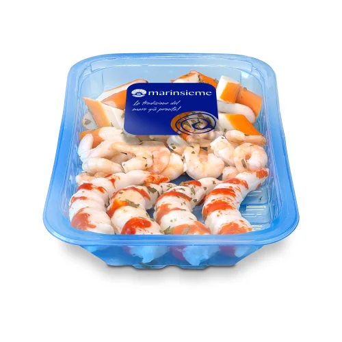 A fresh and vibrant seafood mix with prawns, sliced surimi and shrimp-shaped bites. A colorful, well-balanced dish ready to serve, bringing the fragrance and lightness of the sea to your table.